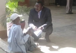 Mkurugenzi wa jiji la Mwanza, Kiomoni Kibamba (mwenye koti jeusi) akizungumza na mlemavu wa miguu aliyefika ofisini kwa mkurugenzi huyo kuomba eneo la biashara. Ambapo Kibamba amemuagiza afisa biashar...
